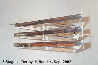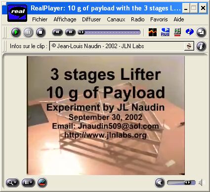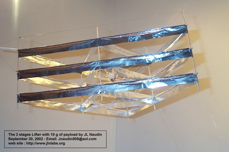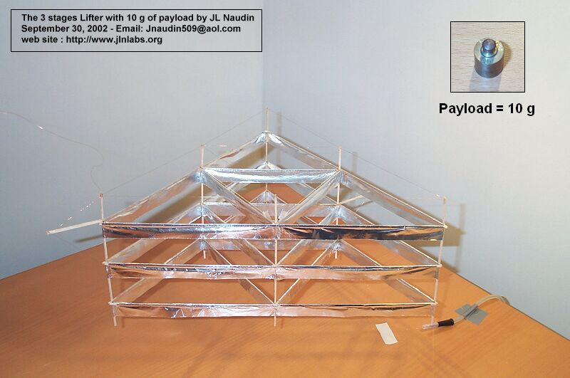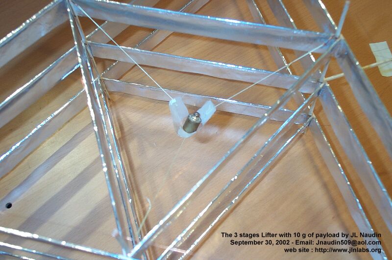 Test result : When the HV power supply is switched on, the Lifter goes upward quickly with the 10 g of payload. The total weight of the 3 stages Lifter is 24 g. The max payload which has been tested successfully is 12 g.