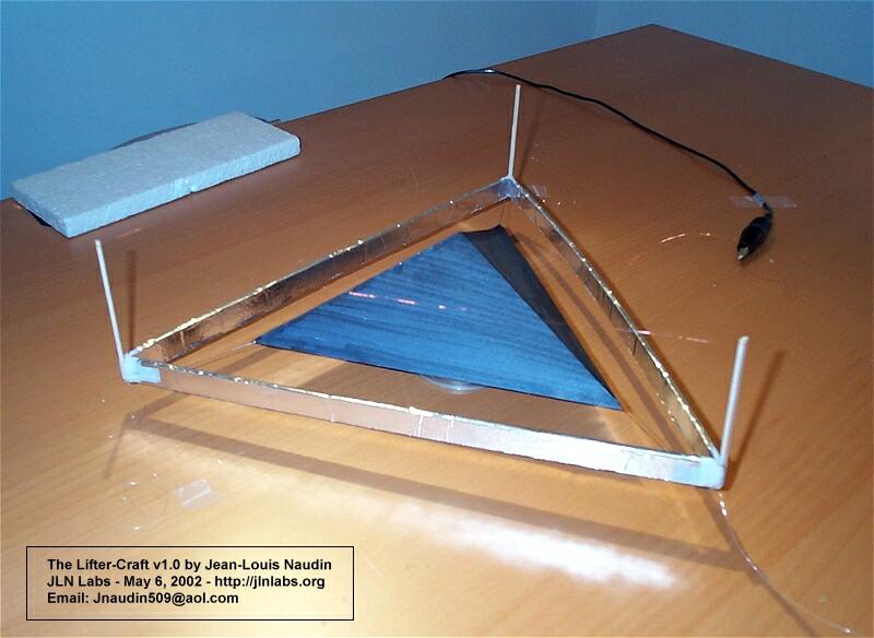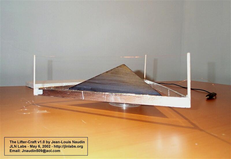 So, I have decided to add, in the center of the Lifter-Craft, a pyramidal box ( see the photos below ) for improving the thrust by using a Bernouilli Effect, I have called this box, the "Bernouilli's enhancer". In a future design, such a pyramidal box will be used as a cargo bay for the on-board electronic equiments ( power supply, batteries, RC components ) :