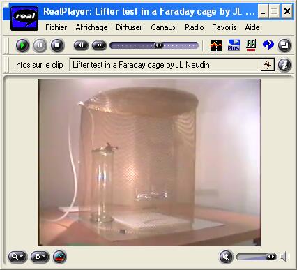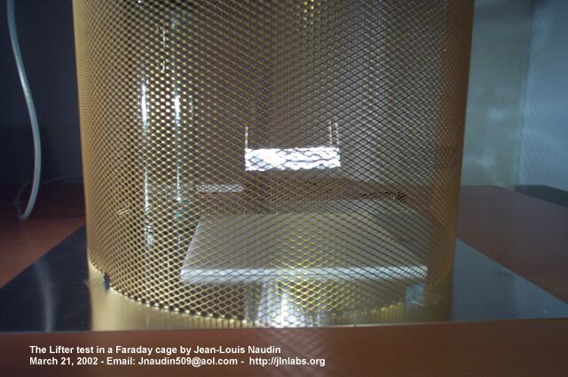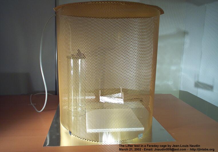Testing setup : The Lifter is placed in a Faraday cage ( 1 meter height and 0.5 m wide ). The Faraday cage is connected to the ground and the high voltage is sent to the Lifter through a special HV cable.