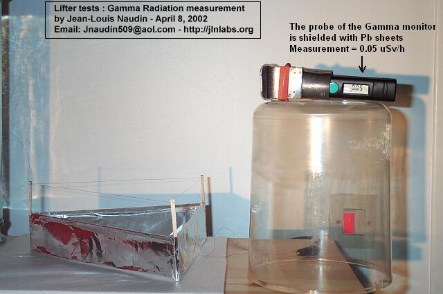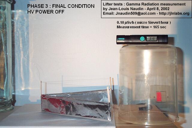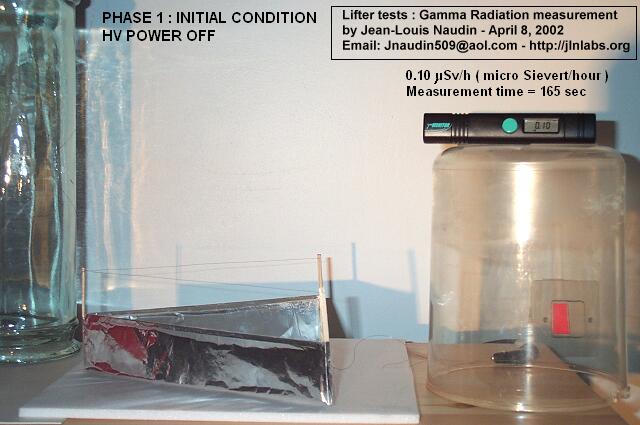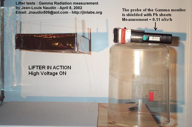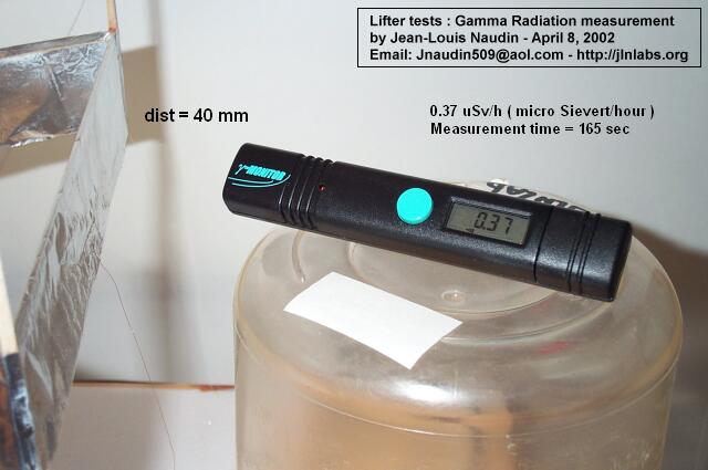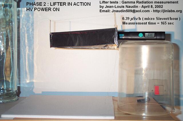 This serie of tests demonstrates that there is a Gamma Radiation emitted by the Lifter in action. The measured Gamma Radiation emitted by the Lifter is real and replicable, but it is very weak. ( For your information : when you go for a pulmonary radiography you receive a 20 uSv dose and the maximum allowed dose for people is 5000 uSv/year ( 0.57 uS/h ) )...