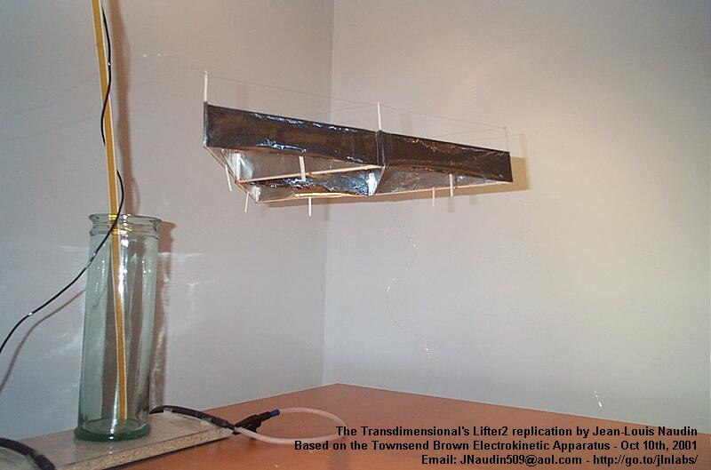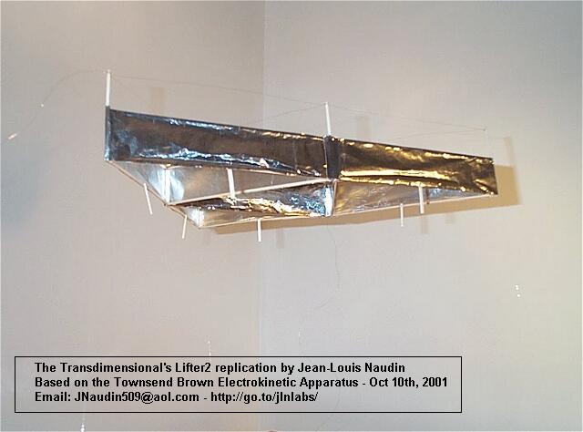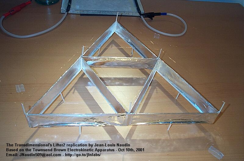 On June 2001, Transdimensional Technologies has presented the Lifter1 and Lifter2 devices. The Lifter1 device was built with three capacitors joined so as to form a triangle assembly and the Lifter2 is three time heavier and three time bigger than the Lifter1. These devices are able to lift their own weight and they are a "modern version" of the Townsend Brown Electrokinetic Apparatus. The Lifters are using the Biefeld-Brown Effect to generate the main thrust to self levitate. I have already built some similar devices in April 1999, see "The EHD Flying Saucer v1.0 ".