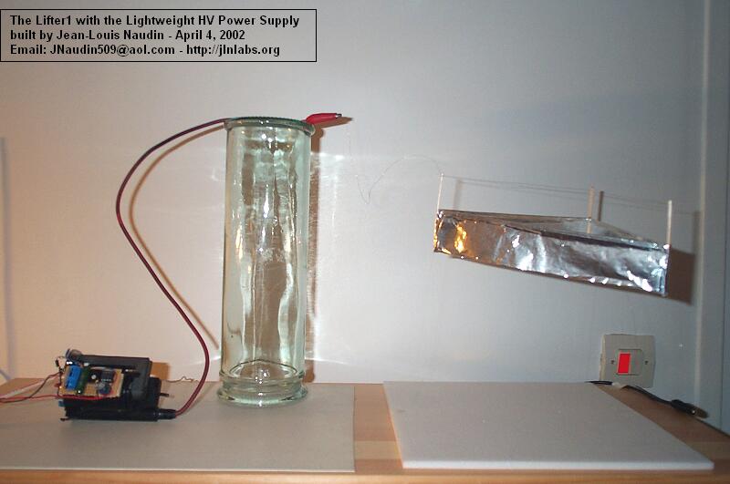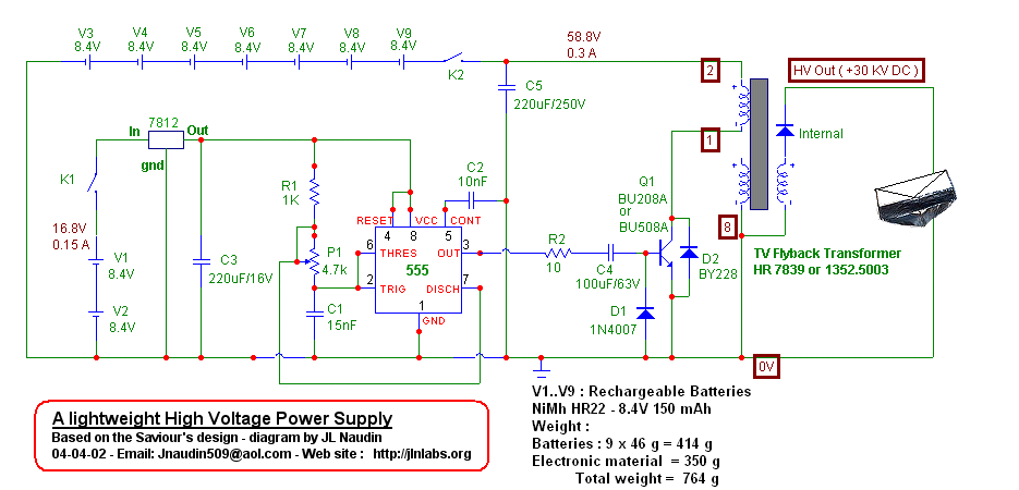 You will find below a detailled diagram of a compact and lightweight HV power supply ( LW-HVPS v1.0 ) for the Lifter experiments. This diagram has been initially designed by Saviour. A such power supply has been used successfully by Saviour in his RC-Balloon Lifter experiment. The LW-HVPS is able to run up to 30 mn on common rechargeable NiMh batteries ( type HR22 ).