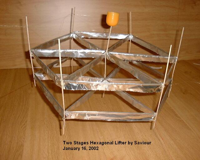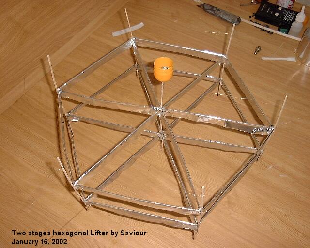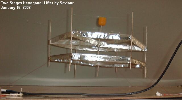 2 vertically stacked hexagonal lifter. 1/2 Kinder egg (0.5g) on top used as container for loads. Air gap between foils is 50-55mm, foil is 20mm each. Note round smooth edge on top side of foil and sharp edge on lower side of each foil. Note that leg supports are not decorative, they are necessary to minimise field effects between the lower edge of the lower foil and the table, even if used on an insulated base.