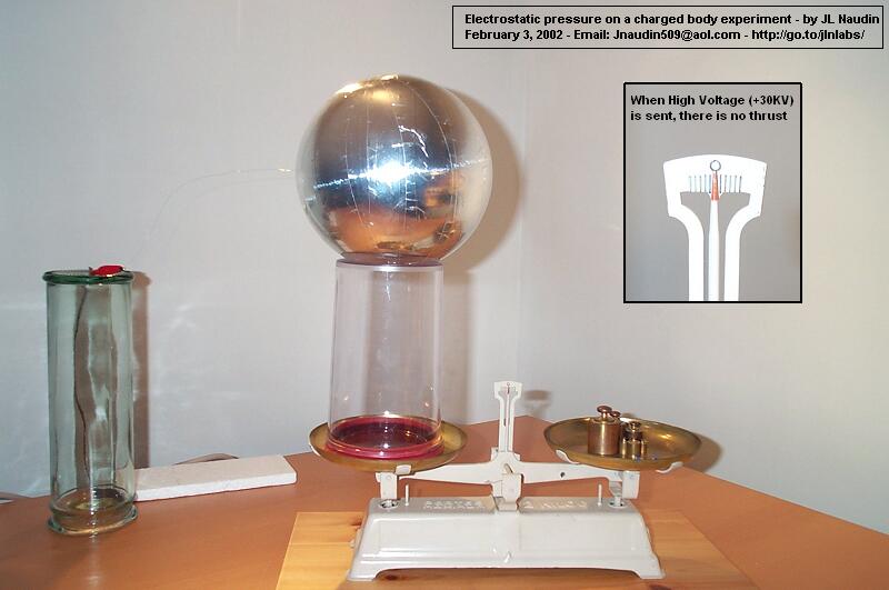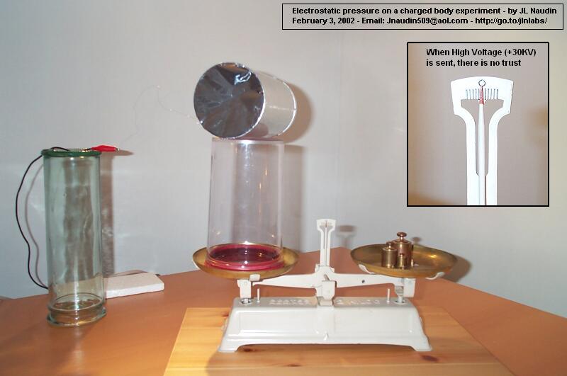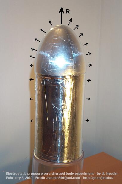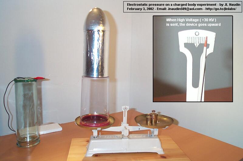 I have built a body fully covered by an aluminum sheet, so that the E-Field inside is equal to zero. This is a cylinder with an ogival shape at one of its extremities while the other is flat. This conductive body, the ESP v1.0, is placed on plastic cylinder base ( 200 mm ) so as to be fully isolated from the beam balance which serves to measure the upward force. A +30KV DC power supply is connected to the ESP through a thin copper wire. If an asymmetrical electrostatic pressure is produced due the special shape of the ESP, it is possible to observe a resulting force along its main axis. To check this fact, the ESP has been placed on a beam balance and two tests have been conducted for checking the resulting thrust along its two axles ( horizontal and vertical ) while it is charged through a High Voltage power supply.