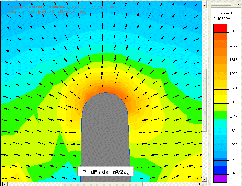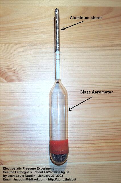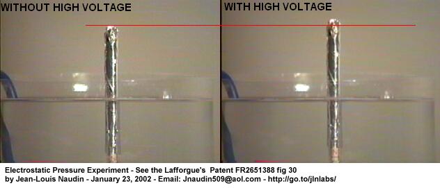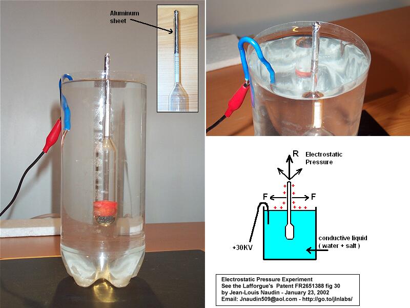 On January 23, 2002, I have tested successfully the Jean-Claude Lafforgue's basic experiment about the Electrostatic Pressure. An asymmetrical electrostatic pressure is the main principle used in his patent for producing a thrust Vs external referential ( the Universe ). Lafforgue has called this the " Action Force " or the " Expansion Force ". The setup of this electrostatic pressure experiment is fully described in his patent FR2651388 page 35. Some translations of the Lafforgue's patent can be found here.