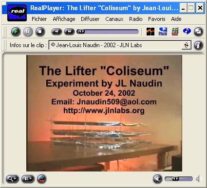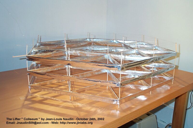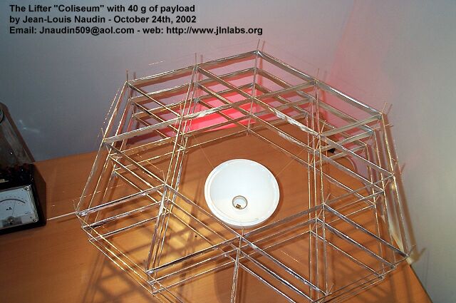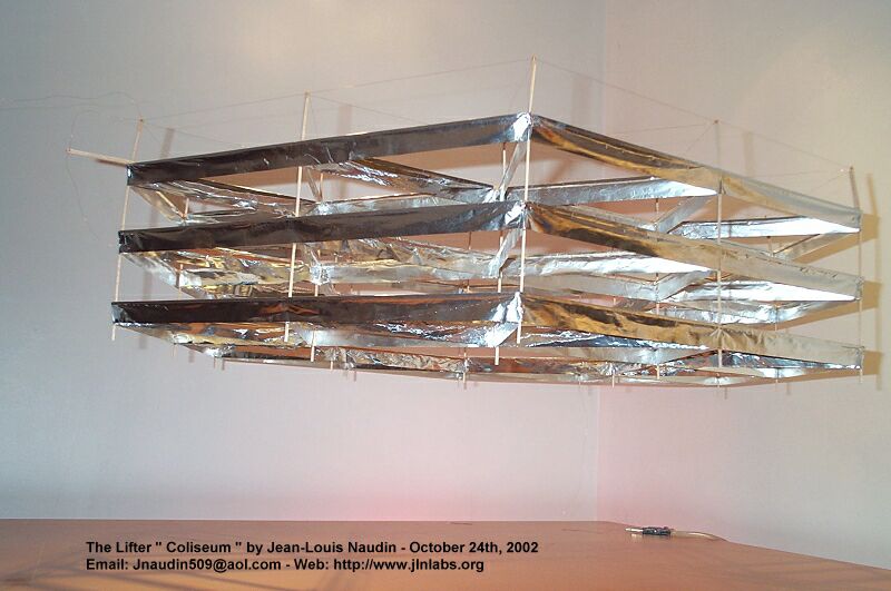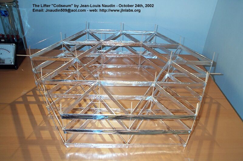 Lifter "Coliseum" specifications The thin wire is connected to the +30 KV, the top aluminum armature is connected to the ground, the middle armature to the +30 KV and then, the bottom armature to the ground. Each aluminum armature is wing shaped with a thick leading edge ( 1.5 mm ) and a thin trailing edge ( 0.12 mm ). The thin trailing edge is equivalent to the first thin wire and produces a strong electric field. There are 108 asymmetrical capacitors.