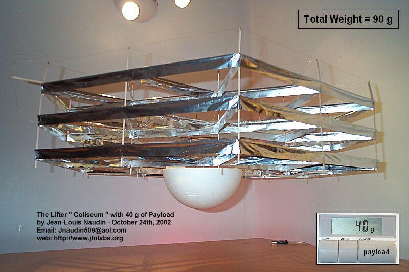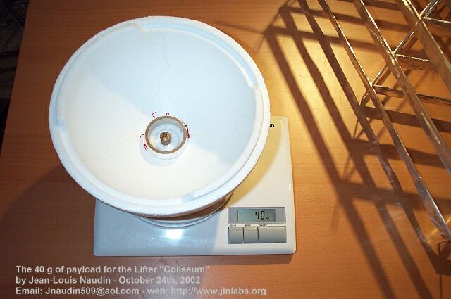 Test result : When the HV power supply is switched on, the Lifter "Coliseum" goes upward quickly with its 40 g of payload. The total weight of the Lifter "Coliseum" is 90 g. ( see below ). With 50 g of payload ( total weight = 100 g ), the Lifter goes up but the hovering is unstable.
