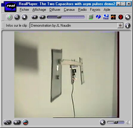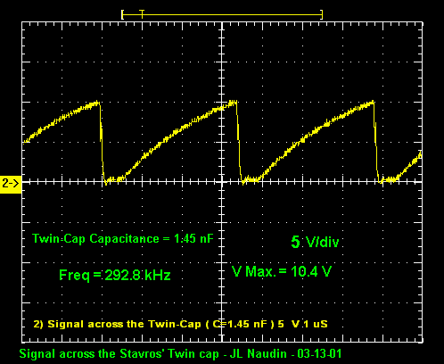 " With the measured capacitance of 1.45 nF for the two capacitors, the fundamental frequency of the waveform should be = (1/(2*pi*1.45nF*376.7 ohm)) = 291.378 kHz (theoretically) or close to that as possible in practice ( Z0 is the free-space impedance ( see formula (11) ).  A peaking of the output thrust is observed when this condition is fullfilled." - Stavros Dimitriou