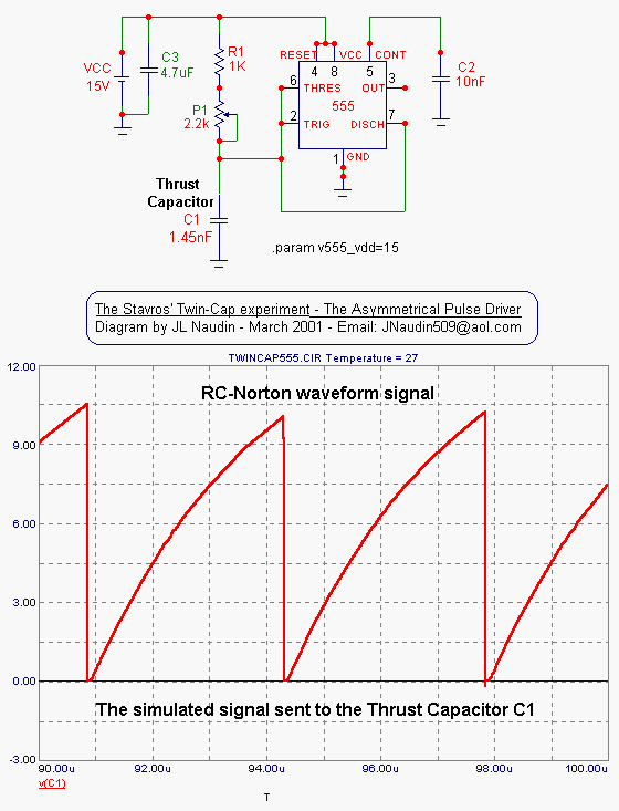 The measured signal shape (below) sent to the Twin-Cap (C1) is fully in line with the RC-Norton waveform simulated above.