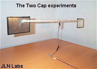 The capacitor used in this case is a twin thin one, made of two thin plates of copper 0.1 mm nominally), having a double-sided self-adhesive tape as a dielectric, of thickness 0.35mm.. The dimensions of this structure are 9.3 by 14.7 cm/ Two rectangular plane capacitors are used with their centers of the rectangles placed 57.4 cm apart, by a lightweight wooden beam.